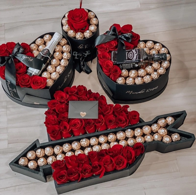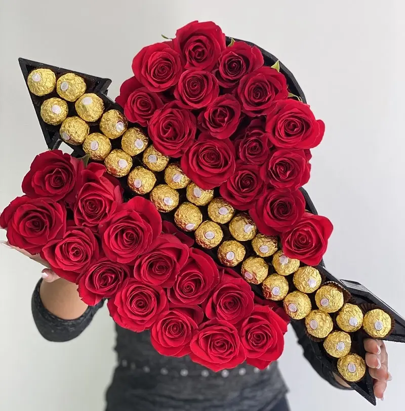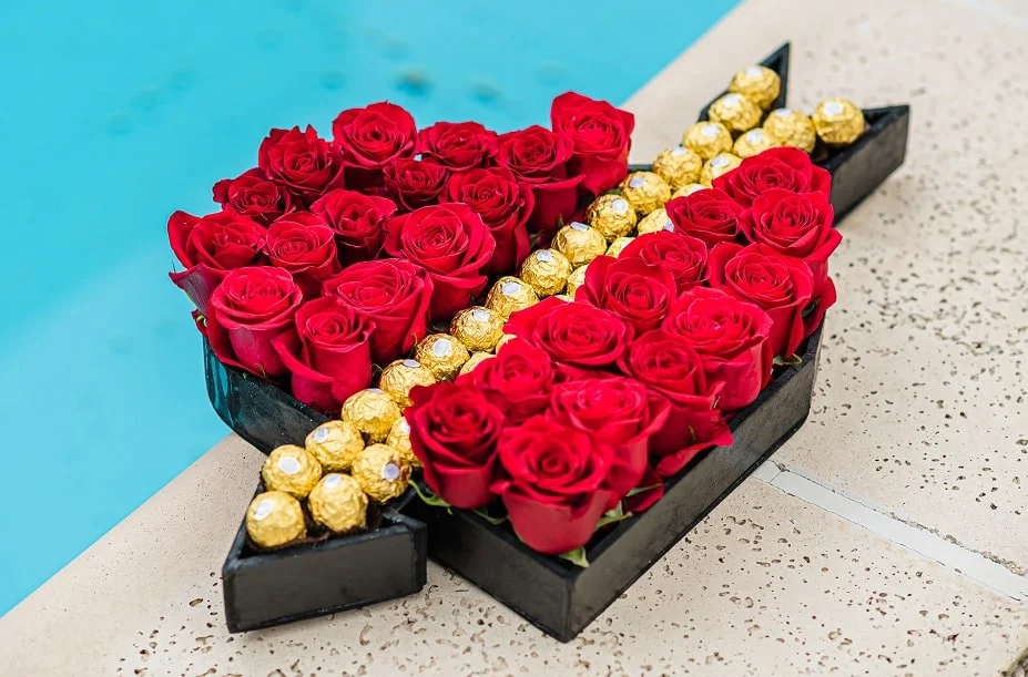 Espectacular caja en forma de corazón flechado, la mejor selección de bombones Ferrero Rocher acompañado de finas rosas ecuatorianas,
