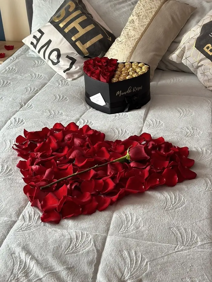 Deja todo en nuestras manos y sorprende con una delicada decoración de habitación. El servicio incluye: