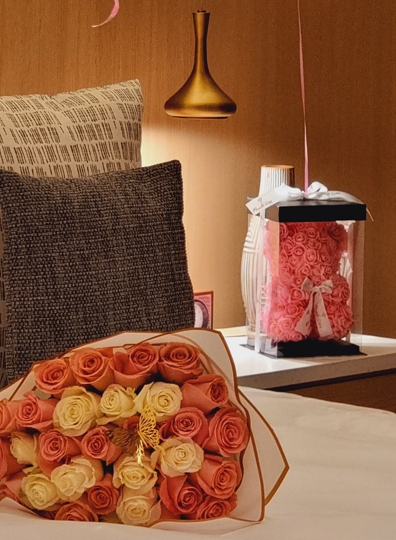 Deja todo en nuestras manos y sorprende con una delicada decoración de habitación Premium. El servicio incluye: