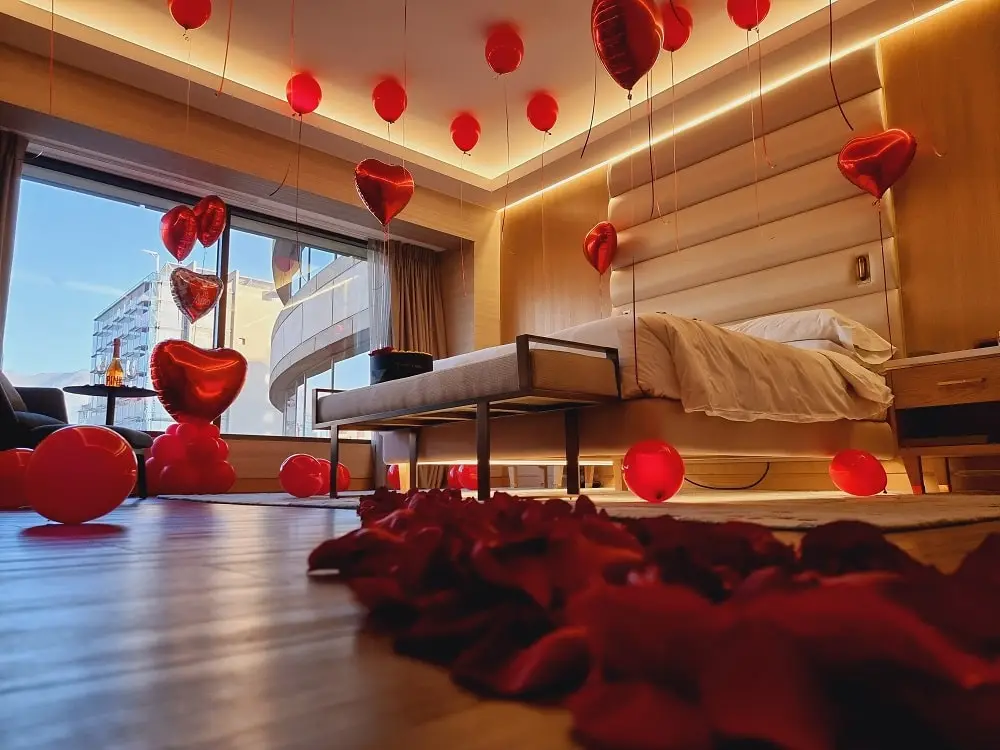 Deja todo en nuestras manos y sorprende con una delicada decoración de habitación. El servicio incluye: