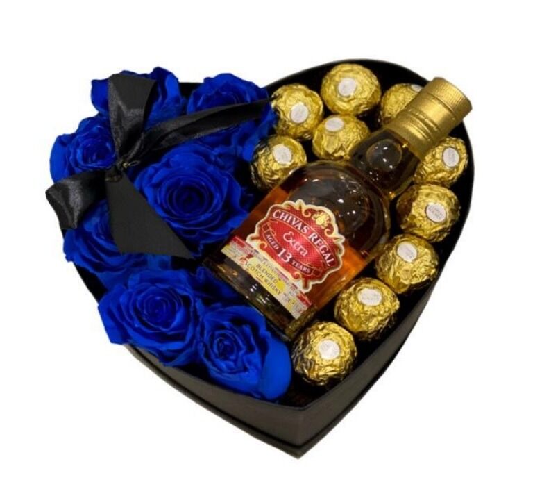 La mejor selección de bombones Ferrero Rocher mas rosas ecuatorianas azules y Chivas regal 200ml