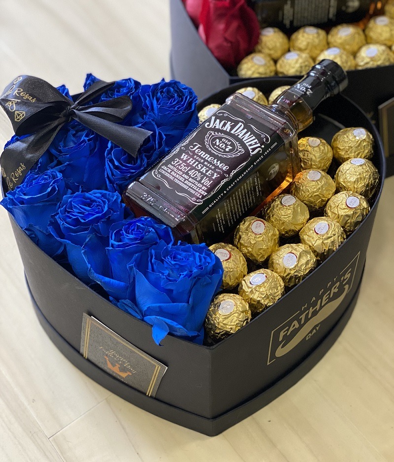 La mejor selección de bombones Ferrero Rocher mas rosas ecuatorianas azules y whisky Jack Daniels N7 375cc
