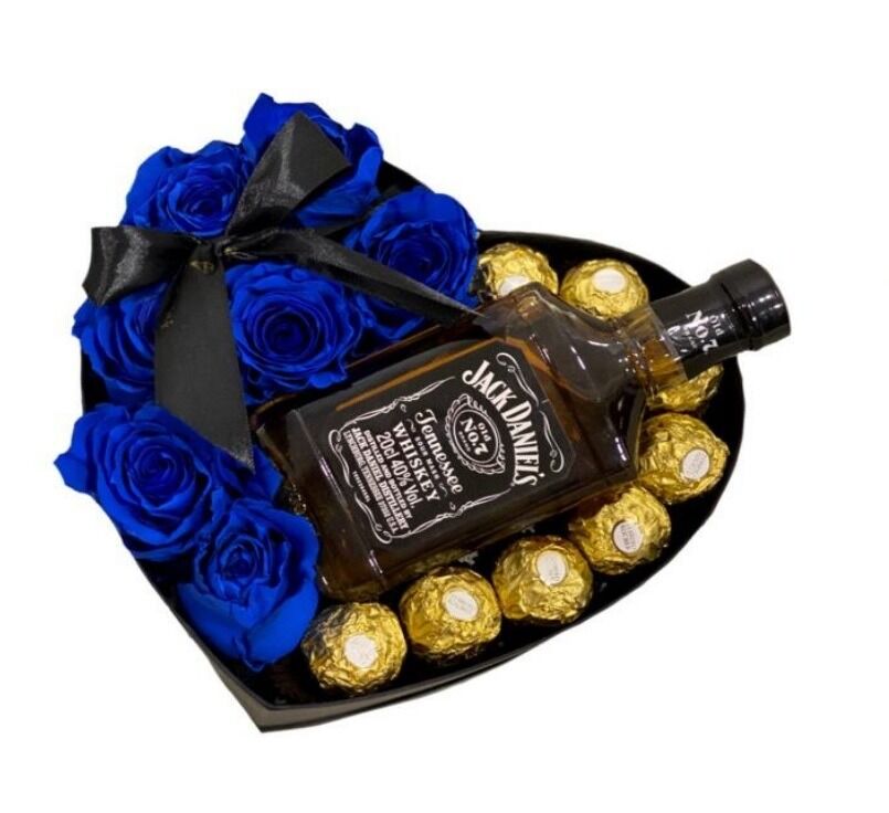 La mejor selección de bombones Ferrero Rocher mas rosas ecuatorianas azules y whisky Jack Daniels 200cc